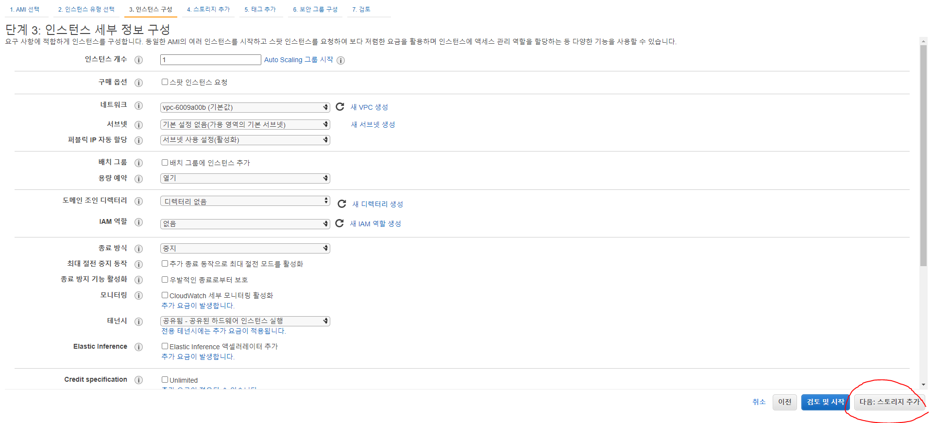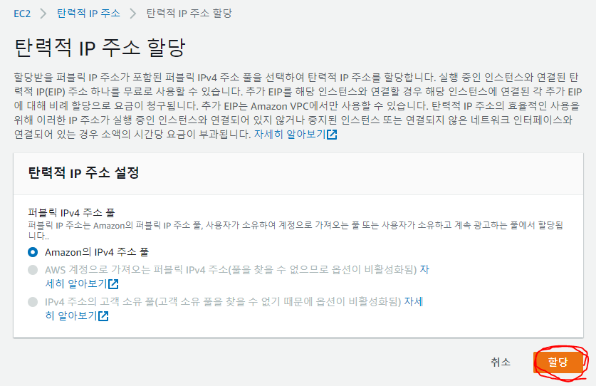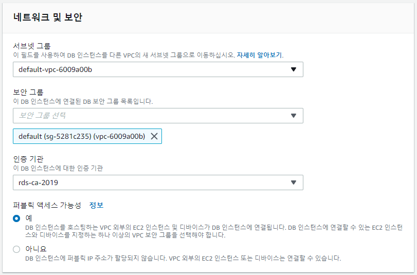 DB이름은 그냥 말 그대로 DB 인스턴스 이름이기에 이쁘게 지어주면 되고 "마스터 사용자 이름", "마스터 암호"는 접속하는데 꼭 필요한 정보이기 때문에 꼭 기억을 해 두던지 기록을 해주자.
