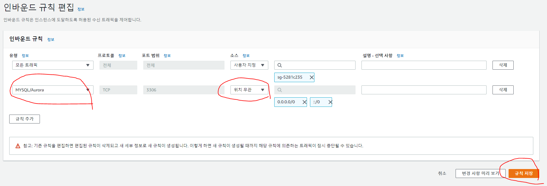 MYSQL/Aurora를 선택하면 포트는 자동으로 설정되고 보안에 따라 위치 무관, 특정 IP만 설정해주면 된다. 그리고 규칙 저장!