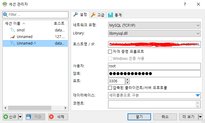 호스트명에는 엔드 포인트를 입력하면 된다. 데이터베이스를 생성할 때 지정한 사용자 이름과 암호를 입력하고 열기 버튼을 누르면 끝.