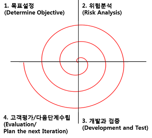 점증적 모델의 한 종류라고 할 수 있다. 계획 목표 설정, 위험분석, 개발, 검증 및 다음 단계 수립 순서대로 반복적으로 실행.