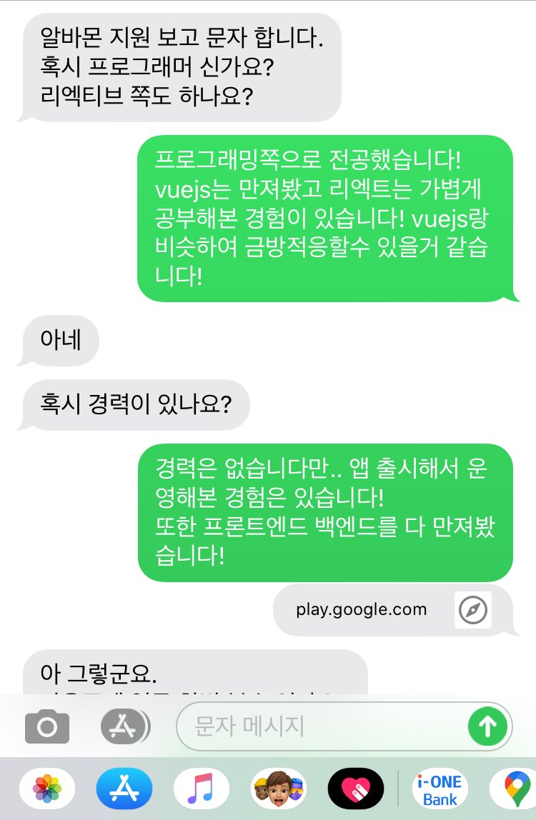 회사에 지원하고 처음 연락이 왔을 때 개발자가 이미 한 명 있다는 소리를 듣고 선배님에게 정말 많이 배울 수 있을 것이라 기대했다. 하지만 대리님과 개발에 있어서 큰 교류가 없었고 나중에는 편의점 할인 품목 가져오기 프로젝트나 대표님의 지시를 받아 테스트용 앱을 개발해도 아무런 피드백을 받을 수 없었기에 대리님에게 배울 수 있는 것은 없었다. 커뮤니케이션을 어떻게, 얼마나 하느냐에 따라 서로 성장하는 속도는 엄청나게 달라진다. 그렇기에 내가 이 회사에 남아있어도 성장은 거의 멈춰있을 것이 확실했다.
